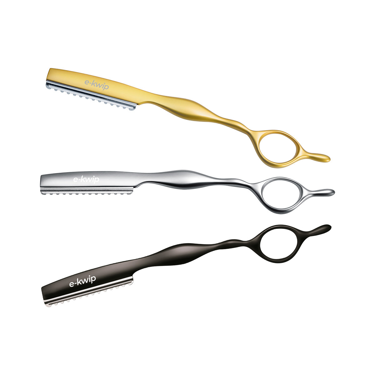 Der E-Kwip Styling-Rasierer vereint elegantes Design mit professioneller Funktionalität. Erhältlich in luxuriösem Silber, Gold und Schwarz, eignet er sich ideal für Detailarbeiten wie Konturieren, Längenkorrekturen oder das Schaffen weicher Übergänge. Dank des ergonomischen Griffs und der passenden Klinge arbeiten Sie optimal kontrolliert und komfortabel.