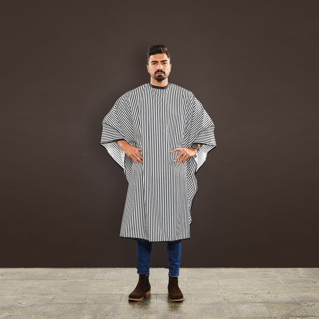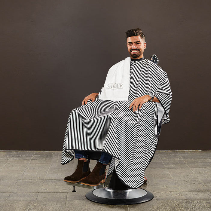 Friseurlaken mit Druckknöpfen zum Schutz der Kleidung beim Haareschneiden und -stylen.