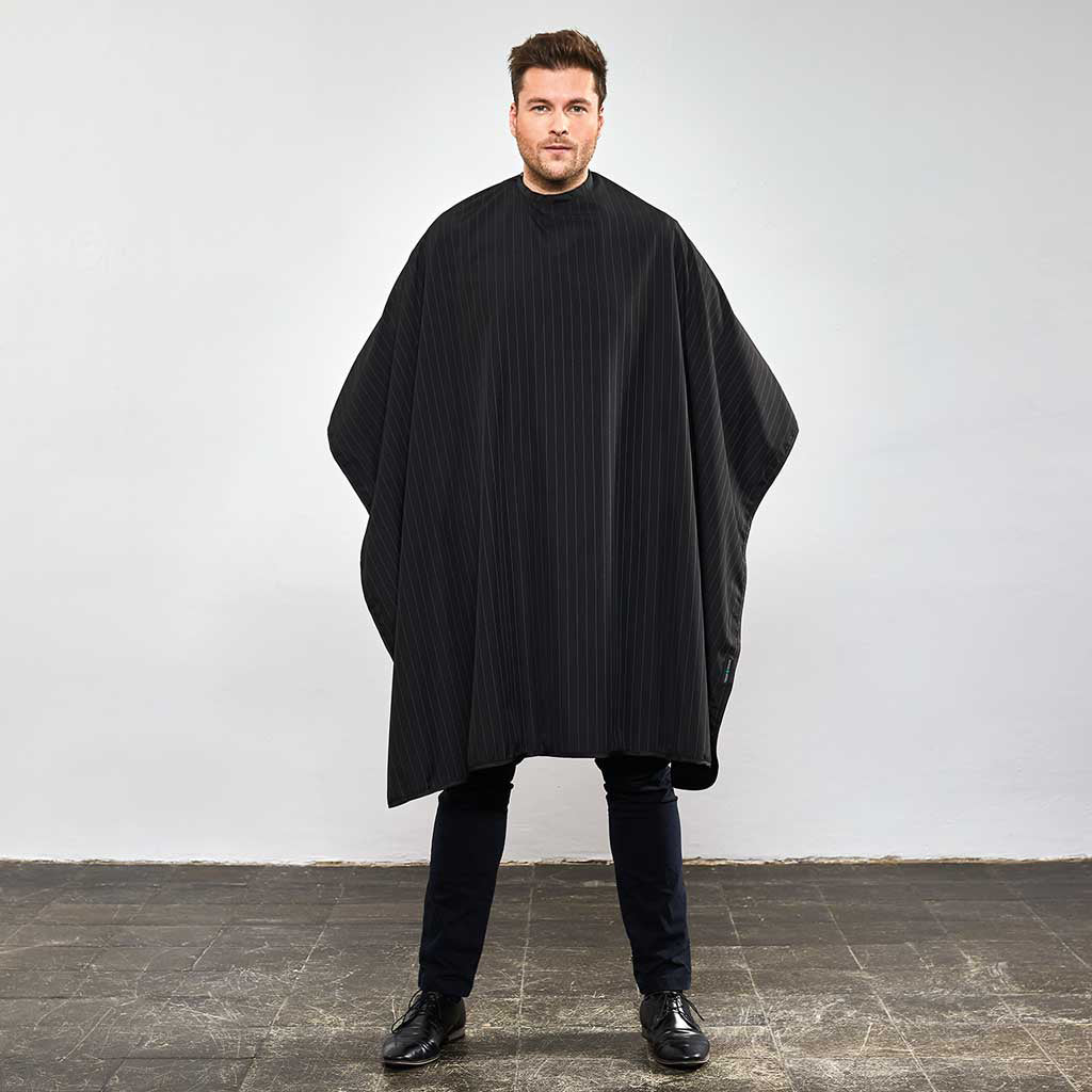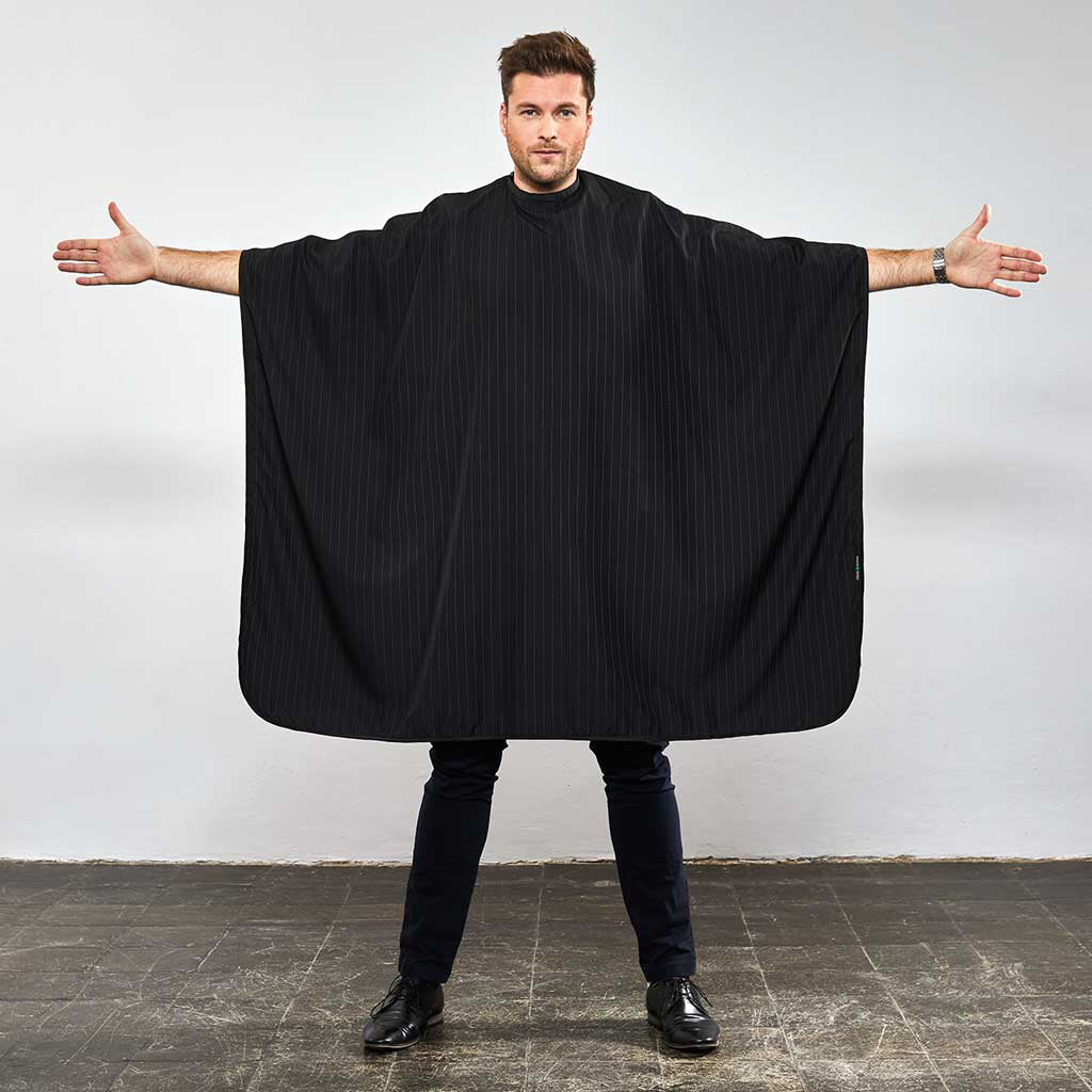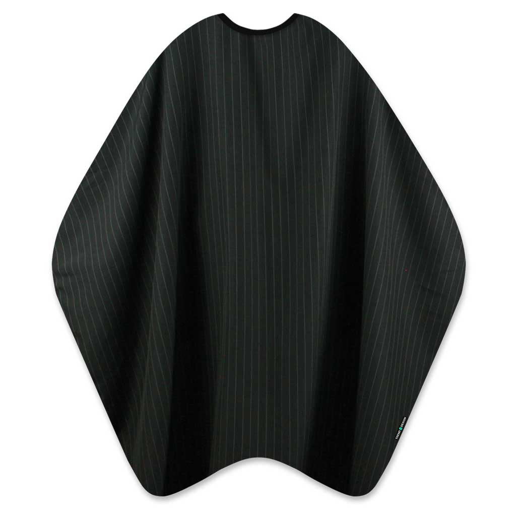 Das Barber Black Chalk Stripe Friseurtuch ist ein Friseurtuch mit Druckknopfverschluss. Das Friseurtuch ist abnehmbar und fühlt sich dünn und glatt an. Schwarz mit weißem Kreidestreifen.
