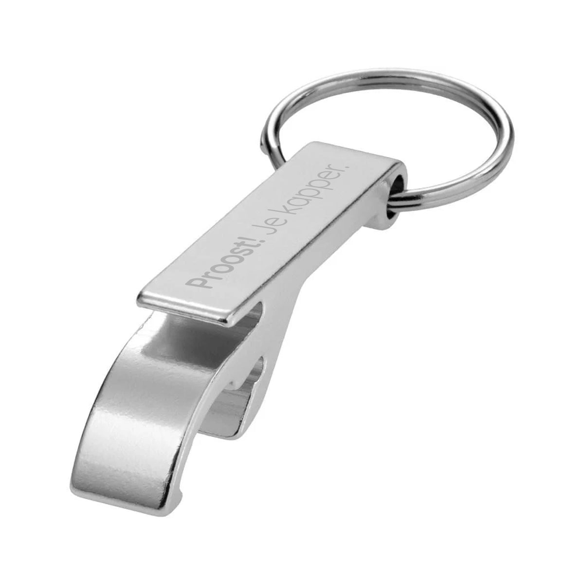 Altijd een flesopener bij de hand én je sleutels goed georganiseerd: deze zilverkleurige aluminium sleutelhanger combineert praktisch nut met een vrolijke boodschap. Dankzij de compacte vorm neem je hem makkelijk overal mee naartoe, of hang je hem aan je sleutelbos.