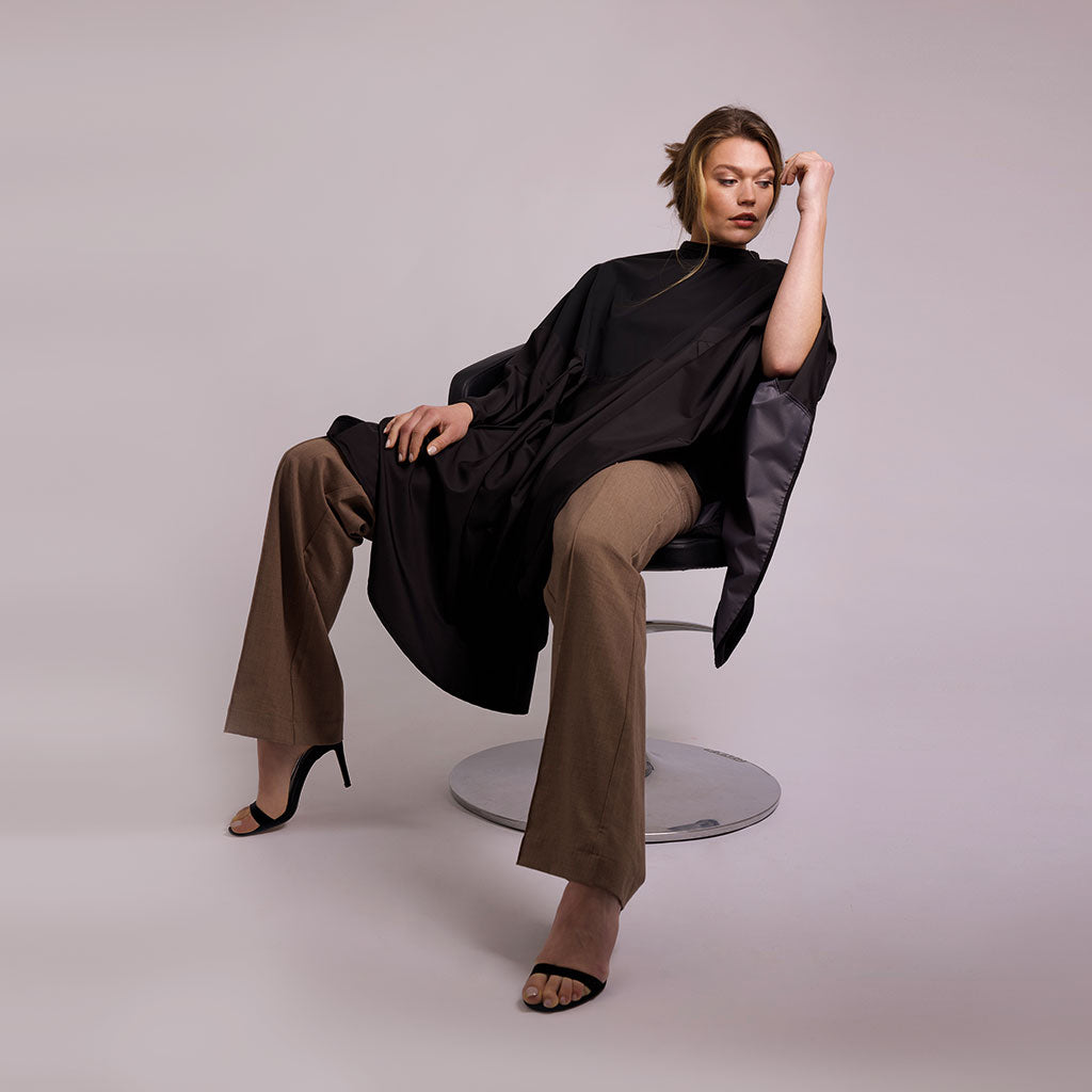 Trend Design Verflaken Balayage Zwart biedt ultieme bescherming tijdens het kleuren en balayage. Dankzij het extra lange achterpand blijft de cape goed op zijn plaats — zelfs wanneer klanten voorover buigen om iets te pakken. Het slimme ontwerp voorkomt dat de cape tussen de stoel en rug glijdt, wat zorgt voor meer werkcomfort en tevreden klanten. Een onmisbaar hulpmiddel voor de professionele kapper.